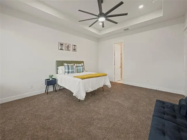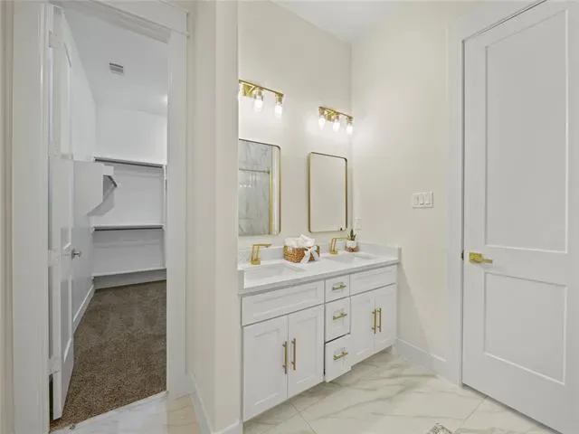 The private primary suite is positioned on its own corner of the home, providing maximum privacy, while the three additional bedrooms are located toward the front of the home, making it ideal for families or guests. The primary bathroom features dual vanities, designer finishes, and a spacious walk-in closet.