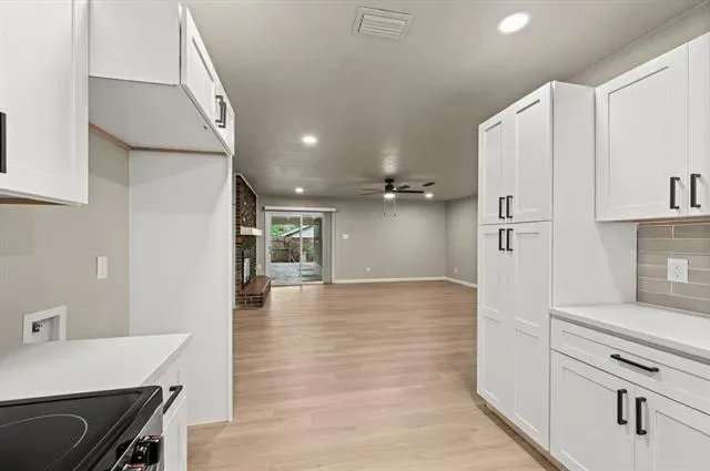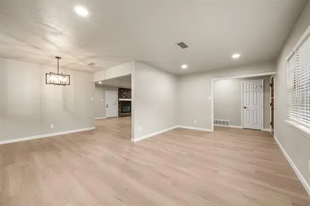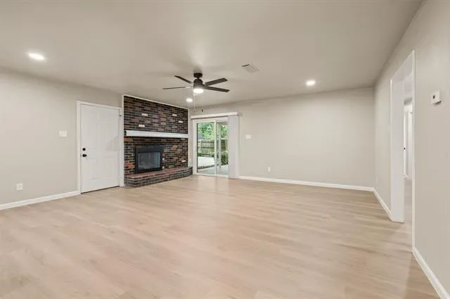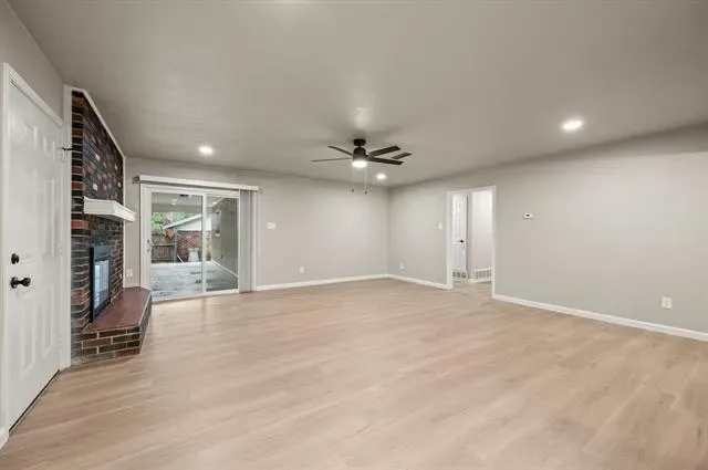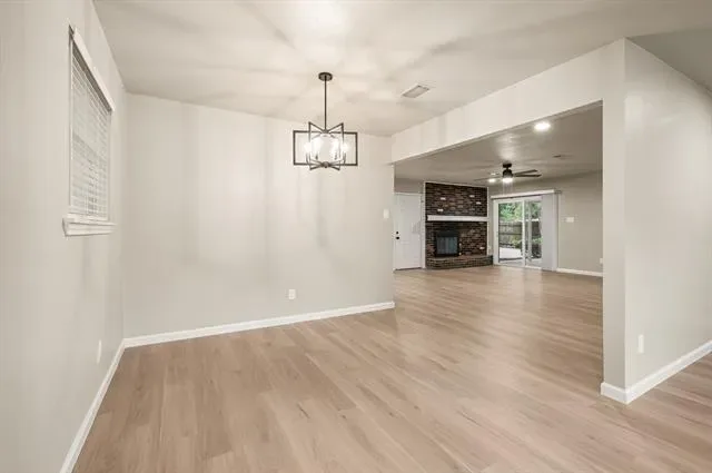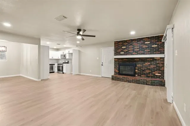 Step inside to a light, open feel with updated flooring, fresh paint, and clean, modern finishes throughout. The spacious living area features a striking brick fireplace, adding warmth and personality while still fitting today’s style. The completely renovated kitchen offers new cabinetry, quartz countertops, stainless steel appliances, and a functional layout designed for everyday living.