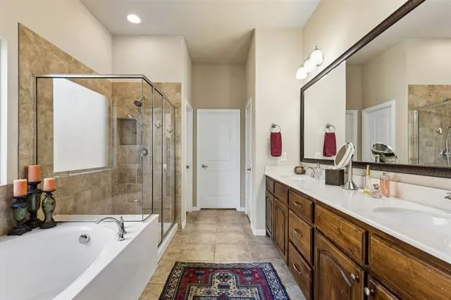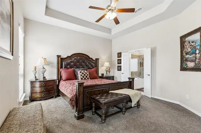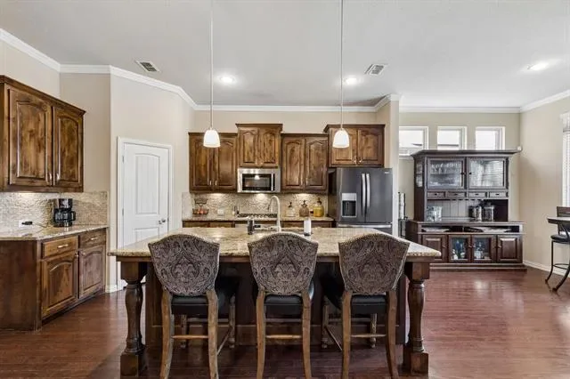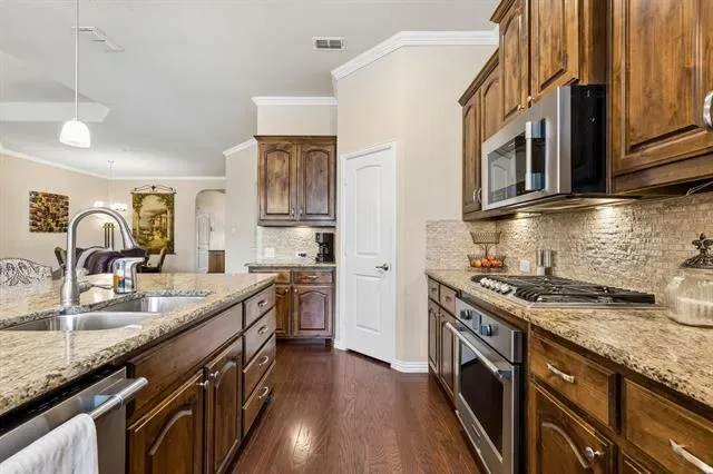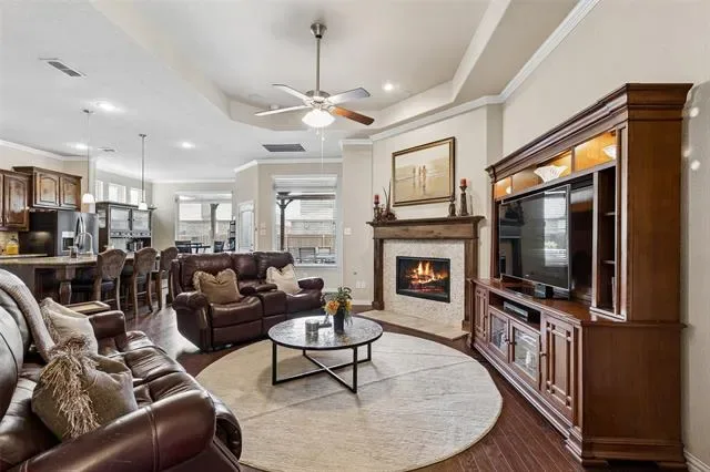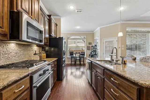 Tucked behind the gates of Sanctuary at Bear Creek, this stunning brick &' stone residence welcomes you with timeless curb appeal &' a spacious three-car garage, setting the tone for the exceptional living experience that awaits inside. Step through the front door &' into a home designed to impress. Rich hardwood floors guide you into an expansive, light-filled living space where soaring dual-layer ceilings, elegant crown molding, and a striking gas fireplace with stone detailing and a warm wood mantle create a sense of both grandeur &' comfort. The open-concept design flows effortlessly into a generous dining area, perfect for hosting unforgettable gatherings or intimate dinners alike. At the heart of the home lies a true chef’s kitchen, outfitted with granite countertops, a tumbled stone backsplash, SS professional-grade appliances + a gas cooktop, this space is elevated by a large island with pendant lighting &' a walk-in pantry that ensures everything has its place. Just beyond, a sunlit breakfast nook offers the perfect spot to start your day. The floor plan is as functional as it is inviting. Privately positioned at the back of the home, the primary suite is a serene retreat featuring a tiered ceiling and a spa-like ensuite bath with dual vanities, a relaxing garden tub, separate shower, and an expansive walk-in closet. Near the front of the home, two well-appointed secondary bedrooms share a full bath, ideal for guests or family, while maintaining privacy from the primary suite. Upstairs, the home continues to impress with space designed for both relaxation and entertainment. A massive game room and dedicated media room create the ultimate setting for movie nights and weekend fun, while two additional bedrooms, each with walk-in closets, and a full bath provide comfort and convenience for everyone. Step outside to your extended covered patio, perfectly suited for entertaining or unwinding in the evenings. The nicely sized backyard is complete with a storage shed.