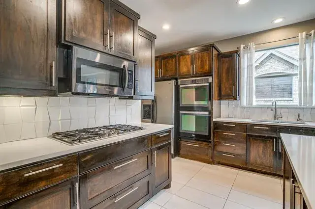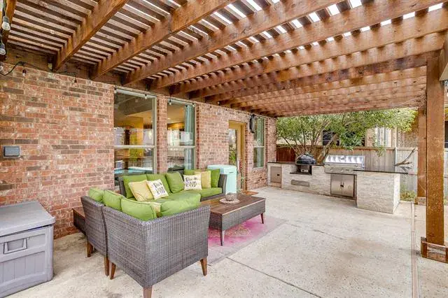 The backyard is the true showpiece of the property and is designed for effortless entertaining with low maintenance in mind. A covered patio and built in outdoor kitchen create an ideal setting for hosting, complete with a Green Egg smoker and grill for outdoor cooking year round. The pool and spa complete the space, offering a private outdoor escape perfect for relaxing or entertaining under the Texas sky.