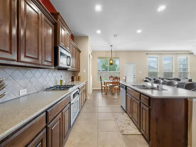 A second chance at this Sendera Ranch gem on a Texas-sized lot! This single-story brick-and-stone home boasts striking curb appeal and abundant natural light. Inside, a spacious open floor plan with hard-surface flooring flows seamlessly to a covered patio and expansive backyard—perfect for entertaining. The open eat-in kitchen features a gas cooktop, stainless steel appliances, and a separate pantry, while the formal dining room is ideal for hosting. The private primary suite offers a walk-in closet, dual sinks, a walk-in shower, and a soaking tub. One of three guest bedrooms doubles as a home office or flex space, making this home as functional as it is inviting. Plenty of storage space in double door garage or 8×12 detached backyard shed. Residents of Sendera Ranch enjoy scenic walking &' biking trails, greenbelts, parks &' community pools just minutes from dining and shopping (Presidio Town Cross, Alliance Towne Center) and major thoroughfares (I35-W &' Hwy 287) with easy commute to Fort Worth. Top-rated, family-friendly Northwest ISD schools are nearby adding up to a well-situated home that balances convenience and comfort with access to neighborhood amenities and generous sized backyard for gatherings or quiet evenings. Buyer’s financing didn’t align, but the home is in great shape and ready for a smooth close. Reach out for details or to schedule a showing