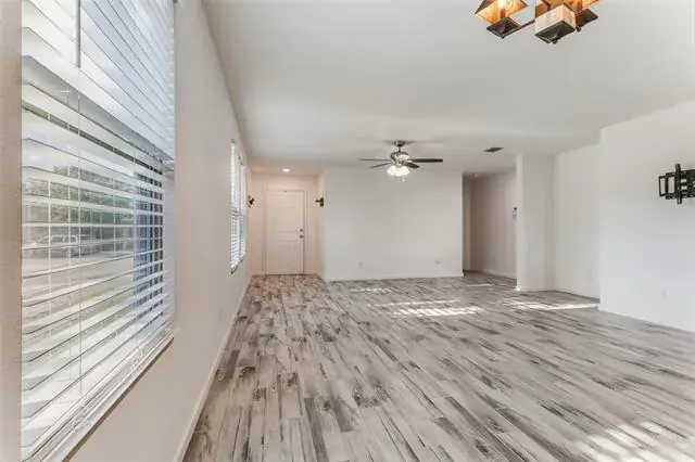 The kitchen shines with new countertops, modern backsplash, new appliances, and a sleek contemporary sink. Living areas feature ceramic wood-look tile, while all bedrooms offer rich wood flooring. The living room includes a versatile nook—perfect for a home office or reading space. The 2-car garage has been upgraded with epoxy flooring and freshly painted walls.