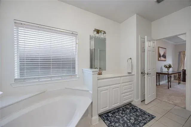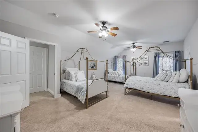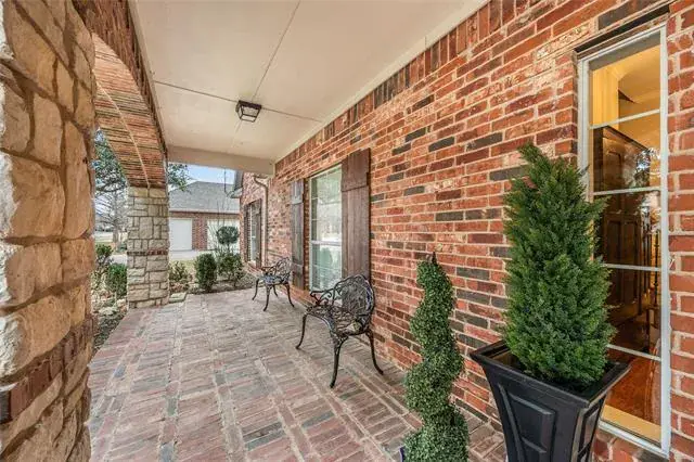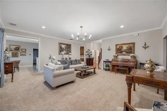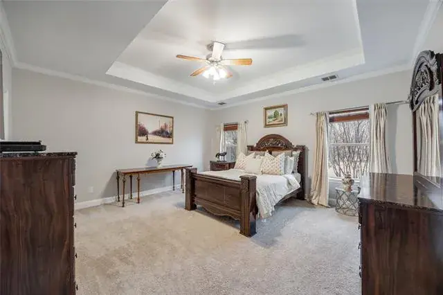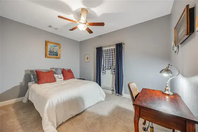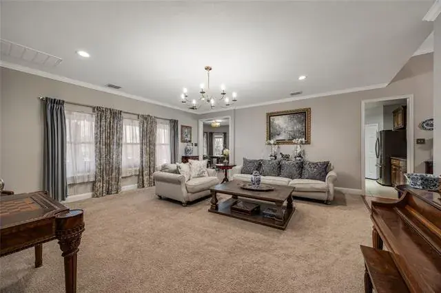 Enjoy the perfect blend of country-style space and neighborhood amenities on this rare nearly half-acre lot. This thoughtfully customized 5-bedroom, 4-bath home features an ideal layout with four bedrooms conveniently located on the main level, offering exceptional single-story living with a versatile second-floor retreat. A charming covered front porch welcomes you inside, opening to views of the extended covered back patio and expansive backyard—perfect for entertaining or everyday relaxation. A formal dining room sits just off the entry, ideal for hosting family gatherings and special occasions. The kitchen is designed for gathering, featuring granite countertops, an island, extended wet bar, and an open flow to the breakfast area and patio. The spacious primary suite offers a private retreat with generous closet space and a well-appointed bath. Three additional bedrooms and full baths on the main level provide comfort and convenience for family and guests. Upstairs, the fifth bedroom with a full bath offers exceptional flexibility and can easily function as a game room, media room, or private guest suite. A small additional office and outstanding storage further enhance the functionality of the second level. Fresh paint throughout and newer carpet make this home truly move-in ready. Completing the home is a 3-car garage with a workbench and extra space, perfect for hobbies, storage, or projects. Just down the street, enjoy the community park featuring a waterfall and pond, playground, pool, and scenic walking trails. With a greenbelt directly behind the backyard and plenty of room to add your own pool, this home delivers space, privacy, and an exceptional lifestyle—inside and out.