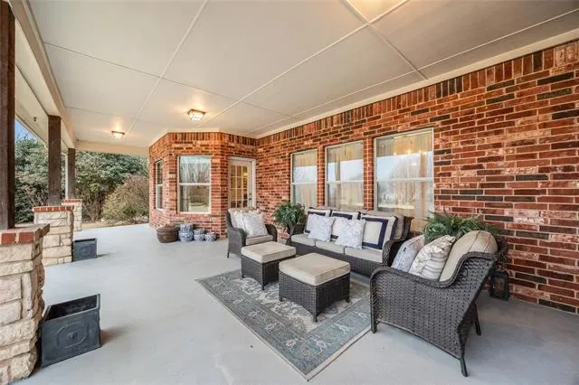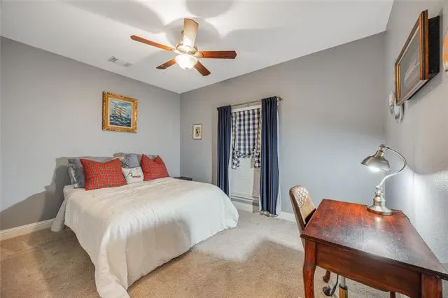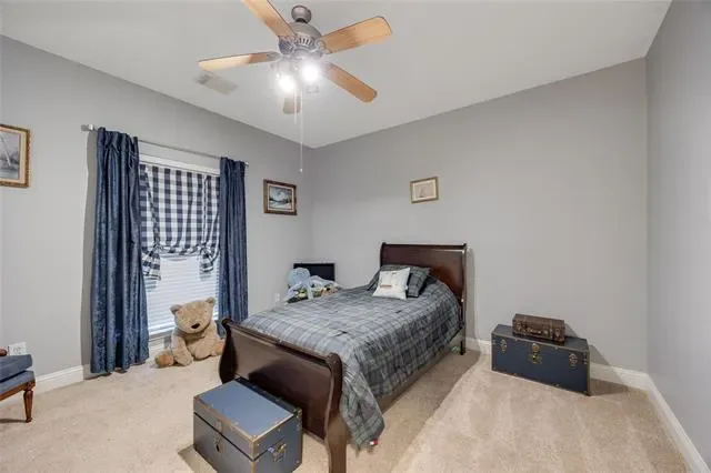Enjoy the perfect blend of country-style space and neighborhood amenities on this rare nearly half-acre lot. This thoughtfully customized 5-bedroom, 4-bath home features an ideal layout with four bedrooms conveniently located on the main level, offering exceptional single-story living with a versatile second-floor retreat. A charming covered front porch welcomes you inside, opening to views of the extended covered back patio and expansive backyard—perfect for entertaining or everyday relaxation. A formal dining room sits just off the entry, ideal for hosting family gatherings and special occasions. The kitchen is designed for gathering, featuring granite countertops, an island, extended wet bar, and an open flow to the breakfast area and patio. The spacious primary suite offers a private retreat with generous closet space and a well-appointed bath. Three additional bedrooms and full baths on the main level provide comfort and convenience for family and guests. Upstairs, the fifth bedroom with a full bath offers exceptional flexibility and can easily function as a game room, media room, or private guest suite. A small additional office and outstanding storage further enhance the functionality of the second level. Fresh paint throughout and newer carpet make this home truly move-in ready. Completing the home is a 3-car garage with a workbench and extra space, perfect for hobbies, storage, or projects. Just down the street, enjoy the community park featuring a waterfall and pond, playground, pool, and scenic walking trails. With a greenbelt directly behind the backyard and plenty of room to add your own pool, this home delivers space, privacy, and an exceptional lifestyle—inside and out.