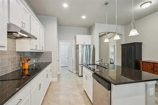 This well designed and carefully maintained 3-bedroom, 2-bath, 2,220 sq. ft. home built in 2018 features an open floor plan filled with natural light and tall ceilings, perfect for everyday living and entertaining. The spacious living room includes a wood burning fireplace and flows seamlessly into the dining area and modern kitchen, which boasts quartz countertops, ample cabinetry, and a large island ideal for gatherings or everyday living. French doors open to a private office, providing a quiet space to work from home. The master suite features a large walk-in closet and a spa-like bathroom with dual vanities and quartz countertops. Two additional bedrooms provide plenty of space for family, guests, or an exercise room. Enjoy outdoor living on the covered patio and fully fenced backyard, perfect for entertaining or relaxing in privacy. Located on a quiet cul-de-sac, this beautiful home combines style, comfort, and functionality, and has been lovingly maintained and is ready for you to move in.