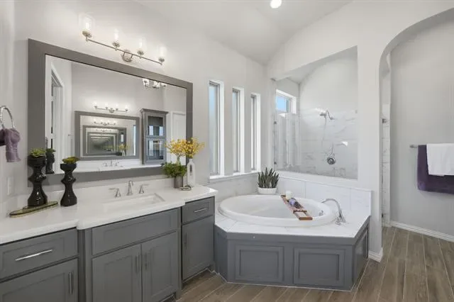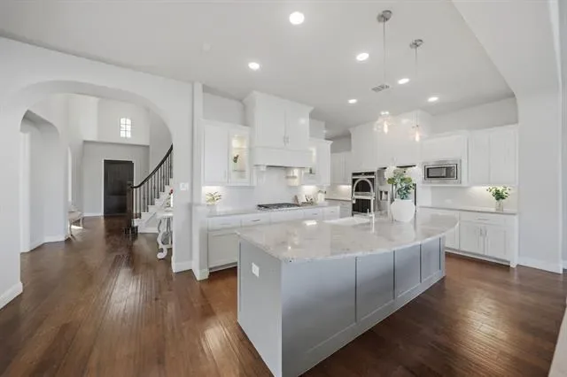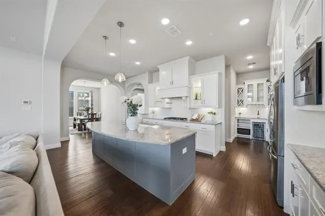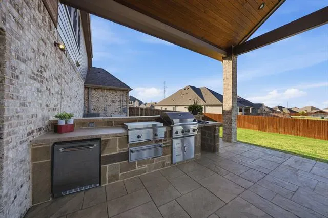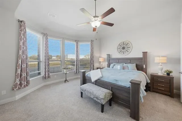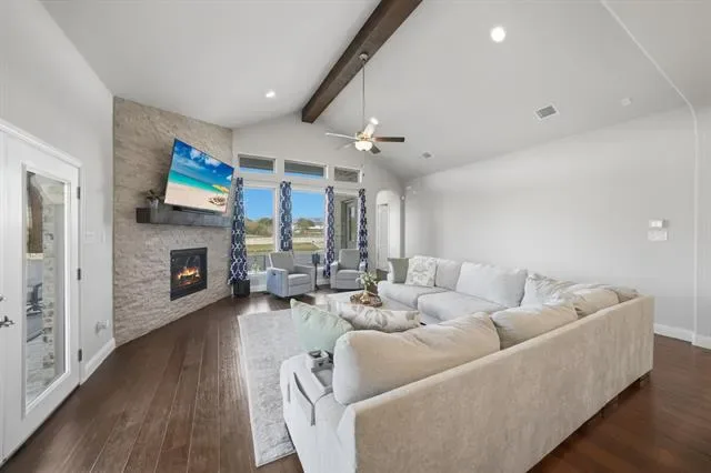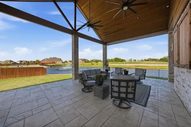 Experience timeless elegance in the heart of North Texas & just minutes away from the quaint historical dining town of Roanoke where the thoughtful design, upgrades galore, & luxurious finishes come together to create an exceptional living experience. From the moment you step inside your breath will be taken away by the outstanding view of the upgraded expansive back covered cedar beamed stone patio w two ceiling fans, outdoor kitchen & grill, hot tub & the floating decorative lighting fountain beaming in from the expansive windows in the livingrm. From the sprawling staircase to soaring ceilings the 20 ft. stained cedar beam stretching across the ceiling adds an extra WOW to the livingrm along with floor to ceiling designer stone gas fireplace. Gourmet chef kitchen boasts section of wine lattice w wine refrig., granite counter tops, moon white cabinetry to the ceiling, shaker wood vent hood w Mission Corbels spice drawer pull outs, deep pot & pan drawers, recycle bin, two glass lighted cabinets w glass shelves, LED under cabinet lighting, soft close drawers, cookie sheet divider, slide out tray, huge walk in pantry, & more! Primary suite is a serene escape overlooking the lighted fountain on the lake w ensuite spa inspired jetted tub, oversized shower, separate vanities, & custom designed closet. Downstairs has guest bedrm, full bath, dining rm, & designated office w french glass doors. Upstairs, you’ll find media rm w equipment, game flex room, two bedrms, & full bath. Short drive to upscale shopping in Southlake, golf courses, lakes, DFW airport. & perfectly positioned within the Northwest ISD. Reel in this beauty today. BEST part is this home is ready to make it your own catch. Imagine stepping into your backyard paradise, casting a line, & enjoying the peaceful lake view with lighted ambiance in the evening every day & night. Don’t let this one slip away! Community offers walking biking trails meandering around catch release fishing lakes, pools, & playgds.