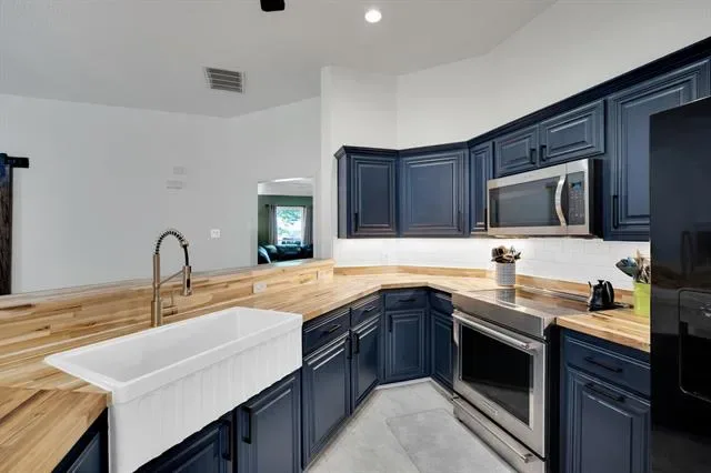 The kitchen is a true standout, showcasing upgraded stainless steel appliances, butcher block countertops, a farmhouse sink, and plenty of prep space for the home chef. Recent improvements include durable vinyl wood flooring, updated fixtures, Low E windows throughout and a recently replaced roof, giving peace of mind and move-in-ready convenience.