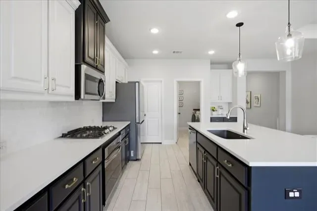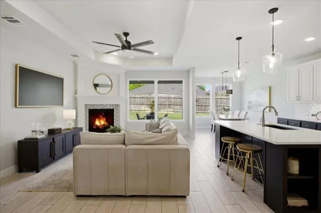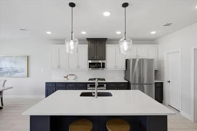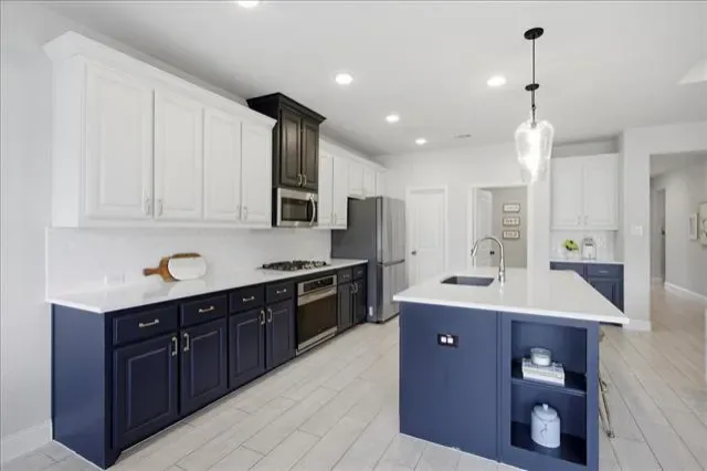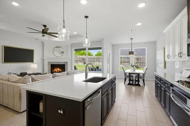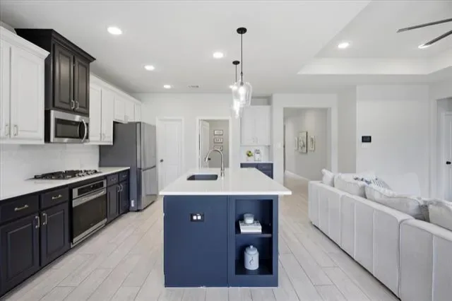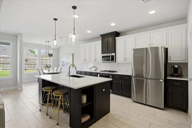 Inside, the open-concept floor plan is designed for both everyday living and effortless entertaining, with seamless flow between the living, dining, and kitchen spaces. The bright, modern kitchen is a true centerpiece, featuring an oversized island with sink, quartz countertops, two-tone cabinetry, a stylish tile backsplash, and abundant storage. A large walk-in pantry, breakfast bar seating, and a spacious eat-in area add both convenience and versatility, all overlooking the main living space and backyard.