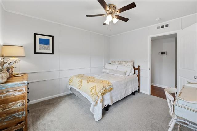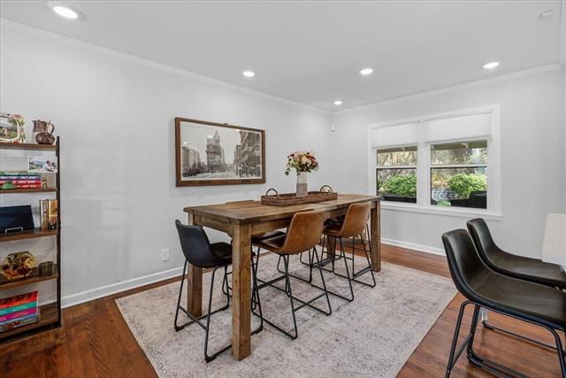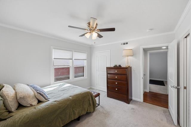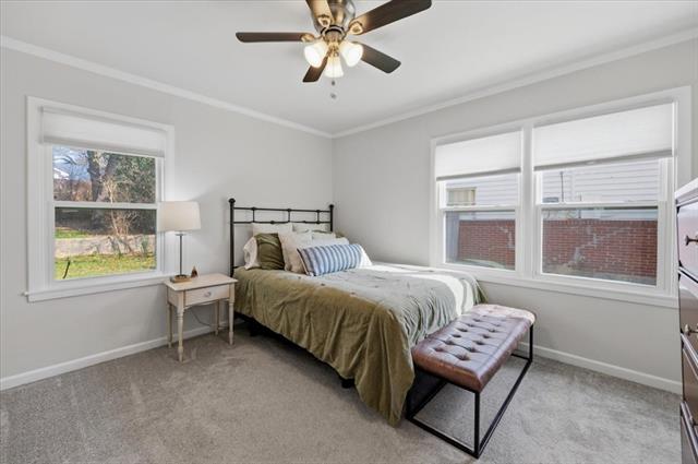 Inside, the warm and inviting layout features original wood flooring throughout the main living areas, carpet in the bedrooms, and tile in the kitchen and baths. The kitchen was updated with white cabinetry, quartz countertops, stainless steel appliances, and a sink overlooking the spacious backyard.