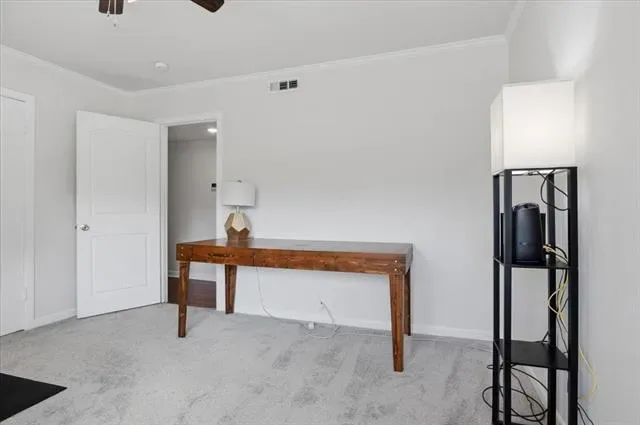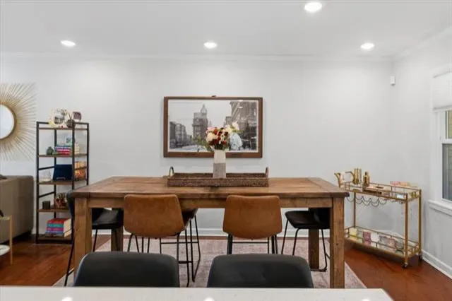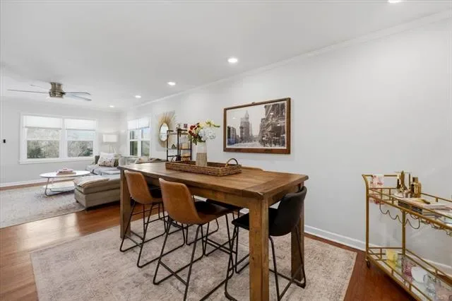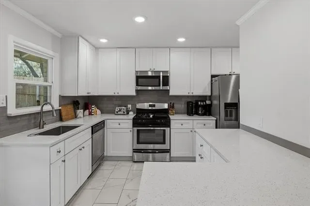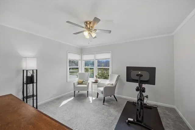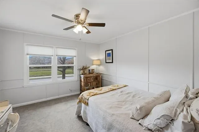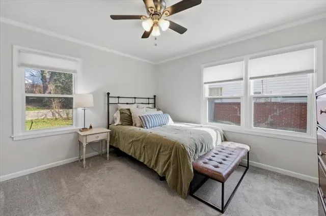 Inside, the warm and inviting layout features original wood flooring throughout the main living areas, carpet in the bedrooms, and tile in the kitchen and baths. The kitchen was updated with white cabinetry, quartz countertops, stainless steel appliances, and a sink overlooking the spacious backyard.
