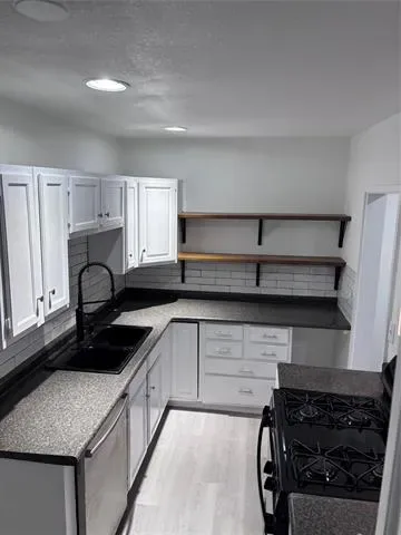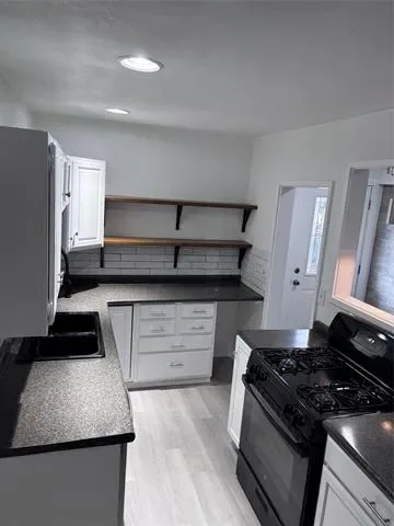 trees.The fully remodeled kitchen shines with white shaker cabinets, open shelving, sleek black granite counters, a