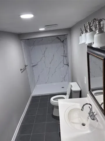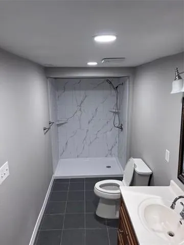 ample closet space. The updated full bath features elegant marble-look in shower, a contemporary vanity, and