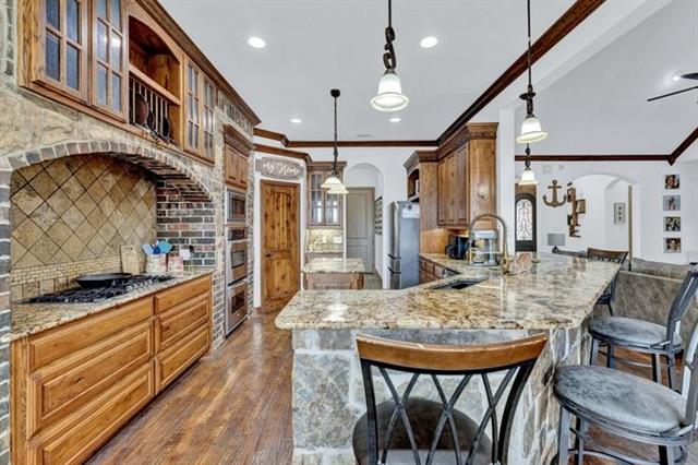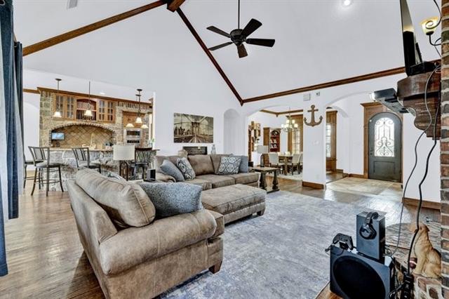 This beautiful 5-bedroom, 3-bath home has it all! Step inside to find hand-scraped wood floors, vaulted ceilings, and a floor-to-ceiling stone fireplace surrounded by custom built-ins. The open-concept floor plan is perfect for entertaining family and friends. The luxurious primary suite features an ensuite bathroom with a walkthrough shower and dual shower heads, a relaxing jetted tub, dual vanities, and an oversized closet with floor-to-ceiling built-ins. The chef’s kitchen offers stainless steel appliances, a gas cooktop, and a spacious walk-in pantry. The fifth bedroom is versatile—ideal for a second master suite, game room, or home office. Step outside to your private backyard oasis featuring an outdoor kitchen, fireplace, and a sparkling saltwater pool with a tranquil water feature. Perfect for year-round enjoyment! Located within walking distance of a beautiful community park, this home truly combines luxury, comfort, and convenience.