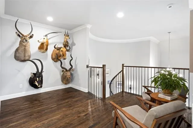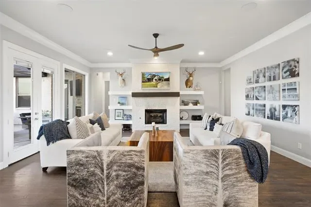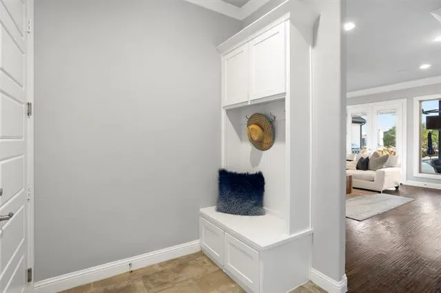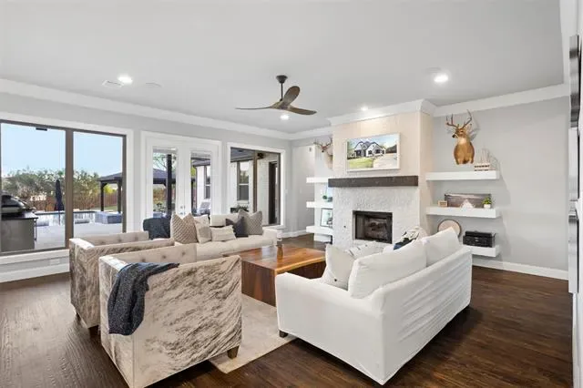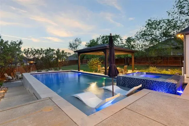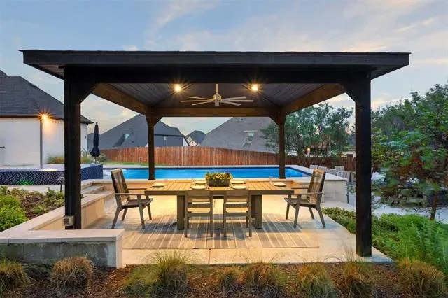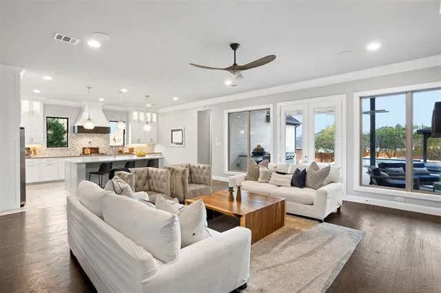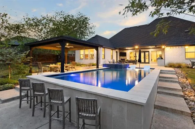 Welcome to a truly custom residence where architectural design, functionality, and luxury living converge in one of North Texas’ most desirable areas. Situated on an expansive ~0.50-acre lot, this 4-bedroom, 3-bath home offers over 3,600 square feet of thoughtfully curated living space with elevated finishes and rare, one-of-a-kind features. From the moment you enter, the home sets itself apart with a custom curved staircase, hand-troweled wall finishes, extensive crown molding, and real hardwood flooring throughout. Oversized windows flood the home with natural light, creating a bright and inviting atmosphere. The open-concept living area connects seamlessly to a chef-inspired kitchen featuring quartz countertops, double ovens, a microwave drawer, built-in wine refrigerator, custom spice storage, and a spacious walk-in pantry. Under-cabinet and display lighting add both function and style. The primary suite on the main level offers a private retreat with vaulted ceilings and a spa-like bath including a soaking tub, walk-in shower with bench seating, dual vanities, and generous storage. The custom closet features built-ins, dresser storage, and a dedicated shoe wall. Additional highlights include a front office with built-ins, oversized secondary bedrooms, a full guest suite downstairs, and an upstairs media room with a 100-inch screen, 4K projector, and surround sound. Step outside to a resort-style backyard with a covered patio, fireplace, built-in audio, and outdoor kitchen with grill and Green Egg. The custom pool and spa feature an infinity-edge hot tub, volleyball layout, seating ledges, and upgraded equipment with WiFi connectivity. The deep, tiered lot provides added privacy and space. Additional features include a 3-car garage with EV Level 2 charger, smart thermostats, dual HVAC systems, built-in storage, and whole-home audio wiring. Located near 287, 35W, and the greater DFW area, this home offers a rare blend of privacy, luxury, and accessibility.
