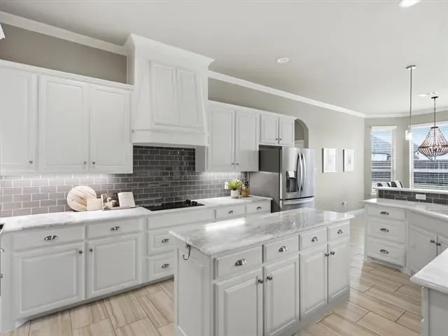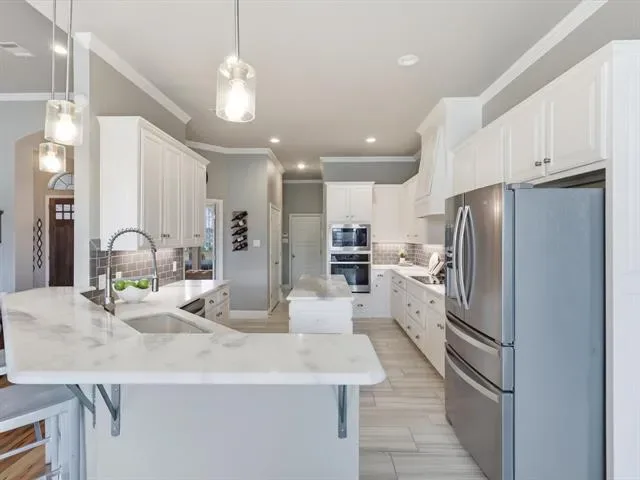 The chef’s kitchen is designed for both everyday living and entertaining, quartz countertops, a large center island, breakfast bar, and an abundance of cabinetry. The kitchen is already equipped with a propane line, making it easy to install a gas range if desired. The open layout flows seamlessly into the living room, where natural light fills the space and custom built in shelving and cabinetry frame the brick wood burning fireplace.