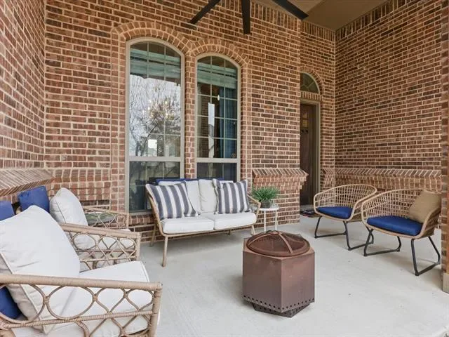 The covered back patio includes a mounted TV and overlooks a generously sized backyard with plenty of space to create your ideal outdoor living area.