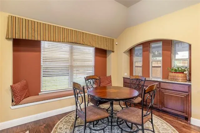 The kitchen showcases granite countertops, an expansive island with breakfast bar seating, gas cooktop, abundant cabinetry, walk-in pantry, and a cozy breakfast nook with a window bench overlooking the backyard. A formal dining area provides an ideal space for hosting. The spacious primary suite offers bay windows, a sitting area, and an en-suite bath with dual sinks, granite countertops, soaking garden tub, separate shower with bench, and walk-in closet. Secondary bedrooms offer flexibility, with two located downstairs near a full bath, including built-ins and a walk-in closet. The fifth bedroom provides versatile functionality, ideal for a home office, flex space, complete with a walk-in closet.