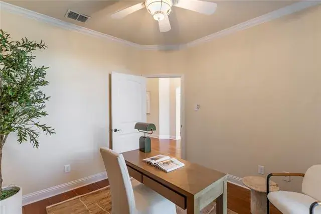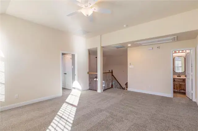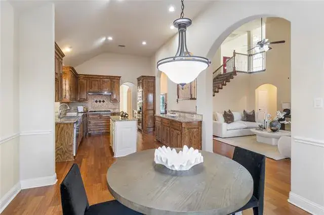 Welcome to this exceptional 4-bedroom, 4-bath home located in the highly desirable Steadman Farms community, zoned for award-winning Keller ISD. Thoughtfully designed for both everyday living and entertaining, this home features fresh interior paint and new carpet throughout, a dedicated office with built-in shelving, a media room, and a versatile loft or flex space. The functional layout includes two full bedrooms and two full bathrooms conveniently located on the main level. The heart of the home is the beautiful kitchen, showcasing a 5-burner gas cooktop, farmhouse sink, abundant cabinetry, and an eat-in layout with a cozy breakfast room. The luxurious primary suite offers a true retreat with an ensuite bath featuring a garden tub, jetted tub, dual sinks, and separate vanities. Several secondary bedrooms include ensuite baths and walk-in closets, providing added comfort and privacy. The media room is fully equipped with a mini kitchen including a sink, small refrigerator, microwave, built-in cabinetry, storage closet, and double doors—perfect for movie nights or entertaining. The laundry room adds convenience with a wall vacuum system transferable to any room. Step outside to the extended covered patio and enjoy the outdoor grill, garden racks, and ample space for pets, play, and gatherings. This home seamlessly blends luxury, comfort, and everyday convenience, all just minutes from major highways, shopping, dining, and entertainment. Enjoy the added convenience of being within walking distance to the community pool and park!