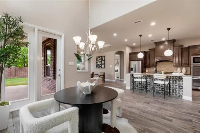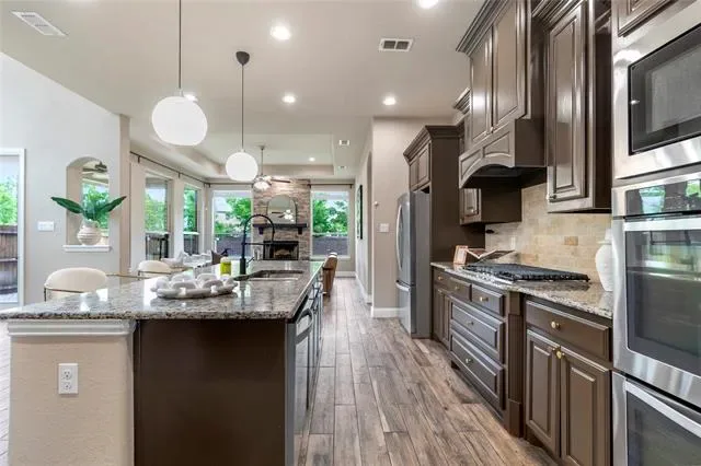 The kitchen is both functional and stylish, offering a large island, granite countertops, 5-burner gas cooktop, double ovens, walk-in pantry, and ample cabinetry, flowing seamlessly into a light-filled eat-in dining area.