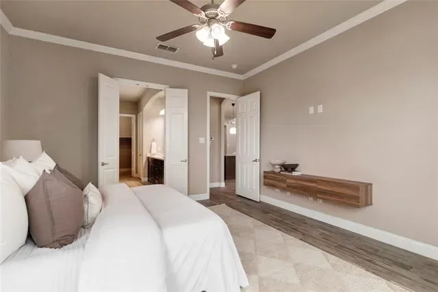 The primary suite features bay windows and an ensuite bath with dual sinks, soaking tub, separate shower, linen closet, and walk-in closet. Secondary bedrooms are primarily upstairs, including a Jack-and-Jill layout, walk-in closets, and additional nearby baths. A versatile fifth bedroom off the entry is ideal for an office or guest space.