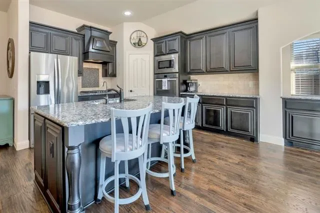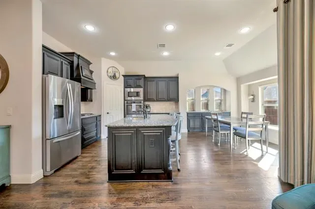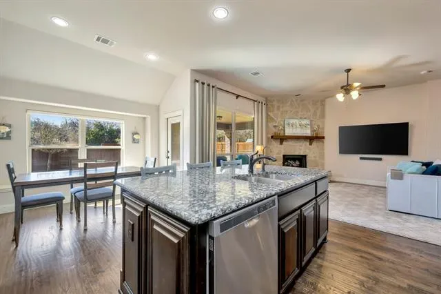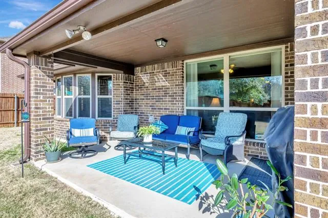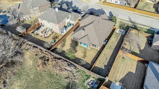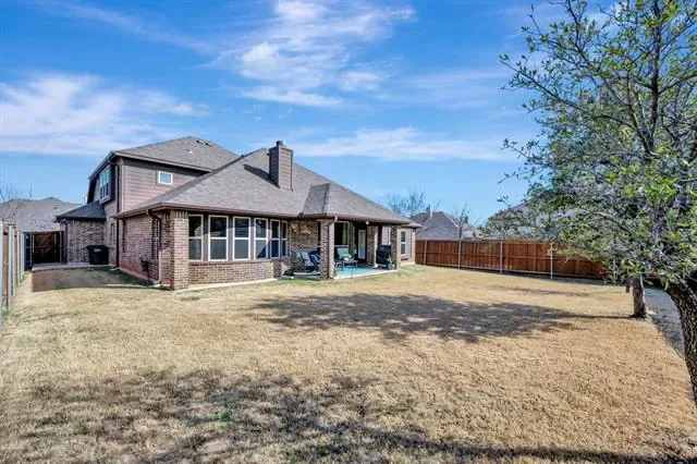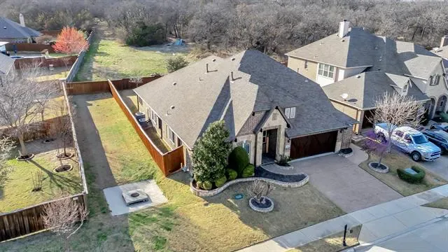 Welcome to this stunning home in the highly sought-after Steadman Farms community, zoned to Keller ISD. Tucked away in North Fort Worth, this pristine neighborhood offers convenient access to grocery stores and dining while maintaining a peaceful setting free from road noise. Even better, this home backs to a wooded area, providing exceptional backyard privacy and beautiful natural views. Featuring the popular Carolina floorplan by Bloomfield Homes, this home boasts gorgeous brick and stone accents that create striking curb appeal. Step inside to a spacious circular foyer with tray ceilings that sets the tone for the thoughtful design throughout. At the front of the home, a versatile bedroom with French doors and a closet makes the perfect office or guest room.The large formal dining room is ideal for hosting gatherings, while the living room impresses with a floor-to-ceiling stone fireplace, gas logs, and a beautiful cedar mantle. Expansive windows wrap around the living area, breakfast nook, and kitchen, filling the space with natural light. The kitchen features tall black all-wood cabinetry, gas cooktop, built-in double ovens, built-in microwave, and abundant counter space that extends into the breakfast nook. The primary suite offers tall ceilings, hardwood floors, and plantation shutters for a refined touch. The en-suite bath includes dual vanities, a soaking tub, and a spacious walk-in shower with bench and modern glass surround. Downstairs also includes two additional bedrooms, a full bath, and a laundry room. Upstairs, a large game room with its own full bath and closet offers endless flexibility as a media room, play space, or even a fifth bedroom. Enjoy peaceful sunsets from the covered back patio and plenty of room to play in the expansive backyard. Residents of Steadman Farms enjoy access to a resort-style pool and playground just a short walk away. This home offers space, privacy, and versatility in one exceptional package. Bonus 2.5 Car Garage.