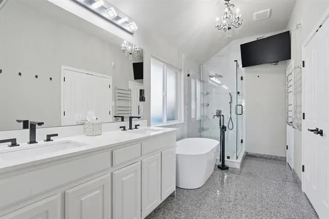 The master bathroom is a luxurious retreat, featuring a soaking tub, a walk-in shower, and a spacious walk-in closet.