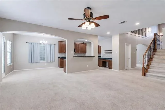Inside, you’ll find an open and airy layout with neutral tones, abundant natural light, and tile flooring throughout the main living areas. The kitchen is well-appointed with granite countertops, ample cabinetry, stainless steel appliances, and a convenient breakfast bar, all flowing seamlessly into the dining and living spaces, ideal for everyday living and entertaining.