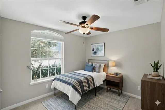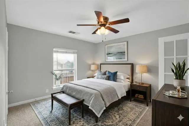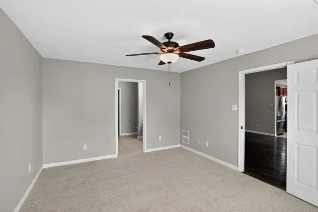 Bedrooms feature plush carpeting, enhancing comfort and style. The primary suite offers a private ensuite bathroom and walk-in closet for added convenience. A dedicated laundry area includes washer and dryer hookups.