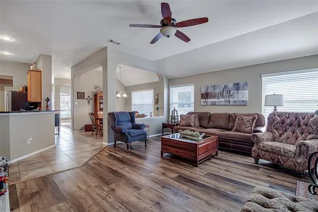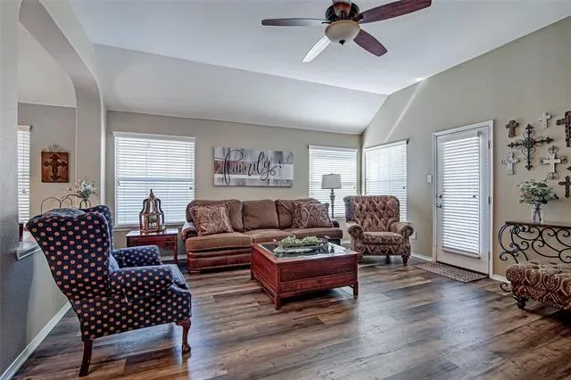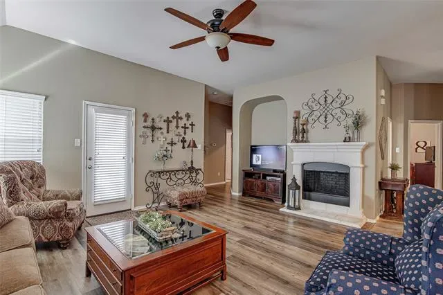Beautiful single-story home in Stone Meadow Addition located in Crowley ISD! This well-maintained 4-bedroom, 2-bath home offers over 2,150 square feet of comfortable living space with an inviting open layout and thoughtful upgrades throughout. The spacious living room features a cozy wood-burning fireplace and flows seamlessly into the kitchen and dining areas—perfect for entertaining. The kitchen is equipped with granite countertops, built-in gas range, microwave, dishwasher, and ample cabinetry. Decorative lighting and built-in features add charm and functionality.