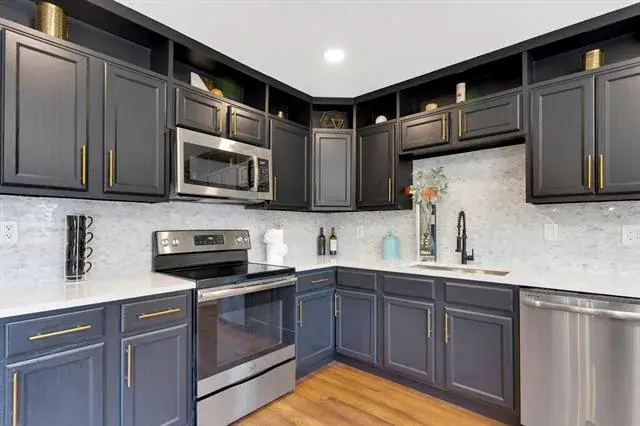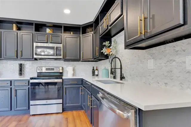 The kitchen features sleek quartz countertops and a fresh, contemporary design, while the living room offers a warm and inviting space perfect for relaxing or entertaining. Gleaming laminate floors enhance the sophisticated feel of the home.
