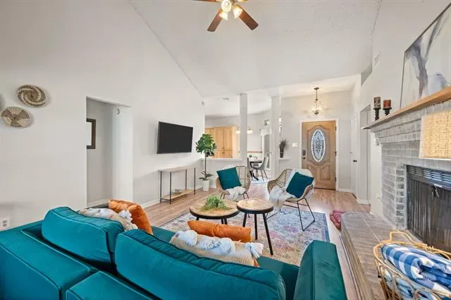 Inside, the home features a functional open layout designed for everyday living and entertaining. The living area centers around a cozy fireplace and flows seamlessly into the kitchen and dining space, creating a welcoming gathering area.