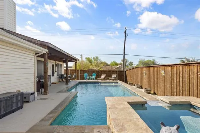 The raised pool deck offers room for lounging and soaking up the sun, while the low-maintenance turf yard keeps everything looking pristine with minimal upkeep. A fully fenced yard adds privacy and includes additional space for pets, play, or gardening.