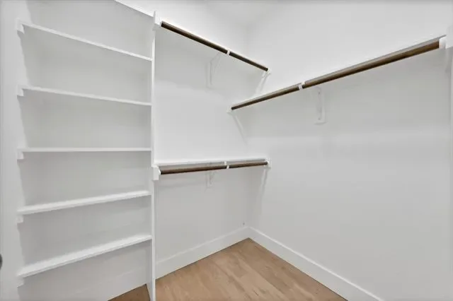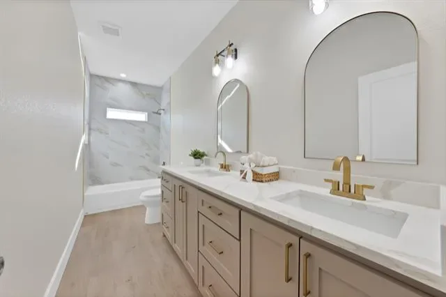 The primary suite is conveniently located on the first floor, tucked into a corner of the home for added privacy. The ensuite primary bath features a spacious walk-in shower, dual vanity, and elegant gold accent finishes that elevate the space. A half bathroom on the main level adds convenience for guests.