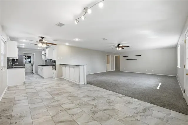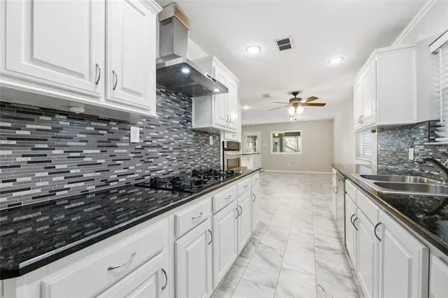 Welcome home to this impeccably updated mid-century modern residence, where timeless design meets refined sophistication. This elegant 3-bedroom, 2-bath, 2-car garage home is thoughtfully curated with designer finishes and set within an established, tree-lined neighborhood. The expansive living room is bathed in natural light from oversized picture windows, creating an inviting yet elevated atmosphere. Plush new carpeting and a sleek ceiling fan complement the space, making it ideal for both everyday living and stylish entertaining. The galley kitchen is a statement of modern luxury, featuring crisp white cabinetry, dramatic black granite countertops, and a custom designer backsplash. High-end stainless steel appliances—including a gas cooktop, separate oven, dishwasher, and disposal—create a space equally suited for casual meals or elevated culinary experiences. The primary suite is a private sanctuary, offering fresh carpeting and a beautifully updated ensuite bath. Indulge in the spa-inspired walk-in shower wrapped in rich, modern tile, paired with black granite dual vanities, dual walk-in closets, and abundant built-in storage—designed for both comfort and elegance. A sun-filled bonus room with expansive windows and sliding glass doors provides exceptional flexibility, perfect for a sophisticated home office, serene reading lounge, or stylish playroom. Outdoors, the private, fenced backyard offers a tranquil retreat, highlighted by a flagstone patio ideal for intimate gatherings or relaxing evenings. An additional greenroom or storage space adds to the home’s thoughtful functionality. This is a must see property.