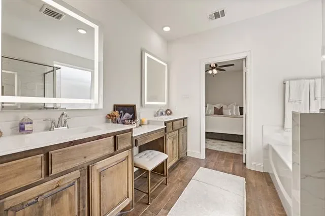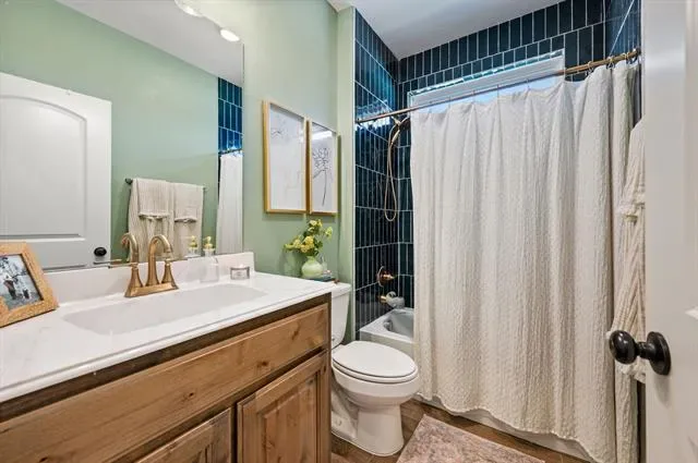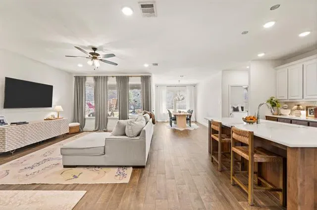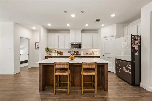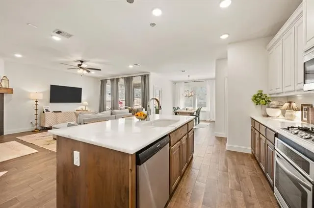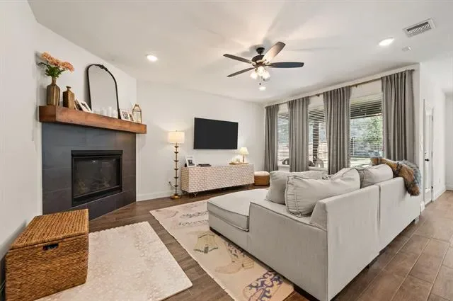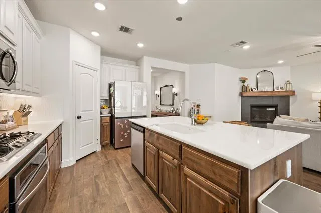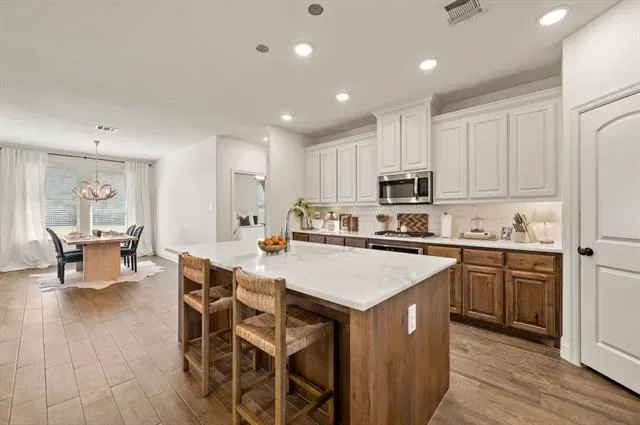 Welcome to this beautifully designed single-story home in Fort Worth, where modern comfort meets warm, inviting style. From the moment you arrive, the charming curb appeal, crisp white brick exterior, and clean-lined architecture set the tone for what awaits inside. Step through the front door into a bright and welcoming entry, highlighted by rich wood-look flooring, soft neutral tones, and thoughtfully curated finishes. The spacious open-concept layout seamlessly connects the living, dining, and kitchen areas—creating an ideal space for both everyday living and entertaining. The living room features a sleek fireplace and abundant natural light, offering a cozy yet elevated atmosphere. The kitchen is truly the heart of the home, complete with a large center island, quartz countertops, stainless steel appliances, and an abundance of cabinetry. The private primary suite offers a relaxing retreat with a spacious bedroom and a spa-like ensuite bath featuring dual vanities, a soaking tub, and a separate glass-enclosed shower. Additional bedrooms are well-sized and versatile, perfect for family, guests, or a home office. Step outside to a backyard built for both relaxation and entertainment. Enjoy the extended flagstone patio—ideal for outdoor dining or lounging—along with a custom flagstone fire pit area perfect for cozy evenings under the Texas sky. The added privacy side yard with an additional gate provides extra flexibility and convenience, while the covered patio offers shade for year-round enjoyment. Situated in a desirable Fort Worth location, this home offers a perfect blend of style, functionality, and outdoor living—ready to welcome its next owners. Schedule your showing today!