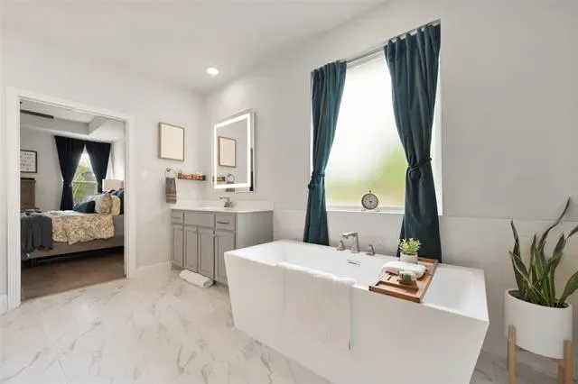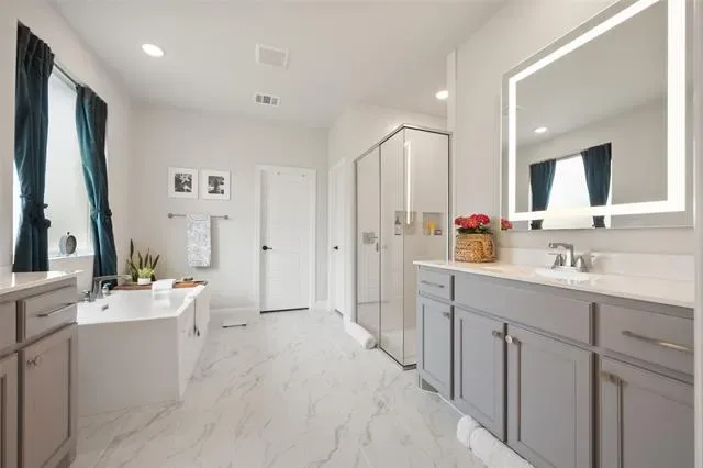 Inside is a spacious floorplan where two bedrooms share a Jack-and-Jill bath, while a third bedroom sits nearby with its own full bath just outside the door—perfect for guests or older children. The private primary suite offers a retreat with a spa-like ensuite and an oversized walk-in closet.