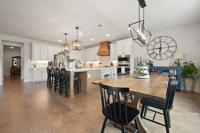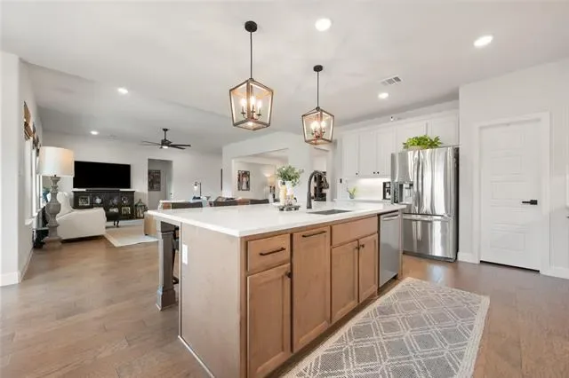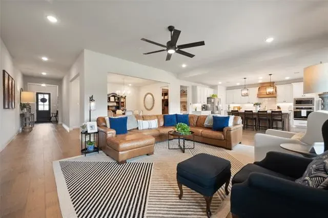 Unwind on the covered back porch with double ceiling fans or step into the large, private backyard backing up to a greenbelt. This home effortlessly blends style, space, and practicality—offering everything you need to live, relax, and entertain in comfort. with so many thoughtful upgrades and flexible living spaces, it''s a home you will want to experience in person. Complete list of upgrades in Transaction Docs. Buyer &' Buyer''s Agent to verify all measurements, schools and tax info.
