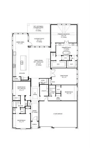 Extended entry leads to open family room, kitchen and dining area. Family room features sliding glass doors and a wood mantel fireplace. Kitchen hosts island with built-in seating space, a 5-burner gas cooktop, and a double wall oven. Game room with French doors just off family room. Secluded primary suite. Dual vanities, a freestanding tub, separate glass-enclosed shower and two large walk-in closets in primary bath. A Hollywood bath, high ceilings, large windows and abundant closet space add to this one-story design. Extended covered backyard patio. Mud room off three-car garage.
