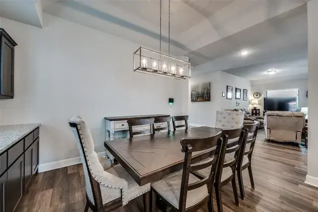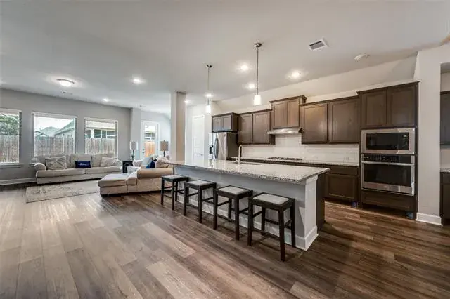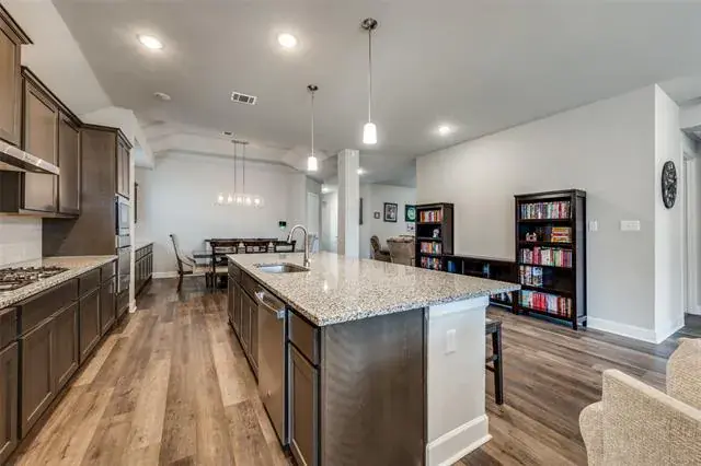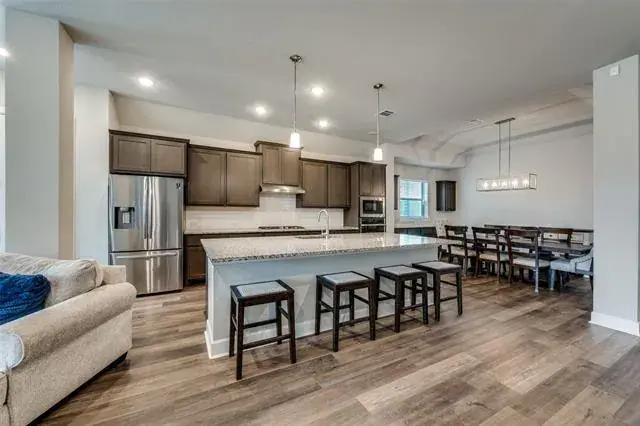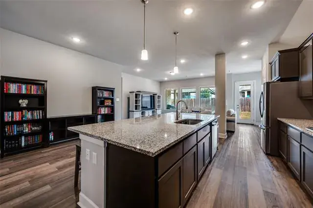 Tavolo Park Subdivision — This well-maintained home, built in 2021, features an open floor plan filled with natural light and offers 2,291 sq ft of living space. The layout includes a den or office, a formal dining area with built-in cabinets and buffet, and a gourmet kitchen showcasing a large island with sink and a pantry. The open living area is perfect for entertaining. The home offers 3 bedrooms and 2 bathrooms, including a spacious, private primary suite with an en-suite bathroom featuring dual sinks, a large walk-in shower, linen closet, separate toilet room, and an impressive walk-in closet with mirror and seating. Enjoy outdoor living under the oversized covered patio, with front and back sprinkler systems. Additional features include a 2-car garage and a convenient location close to shopping, schools, hospitals, and easy freeway access.