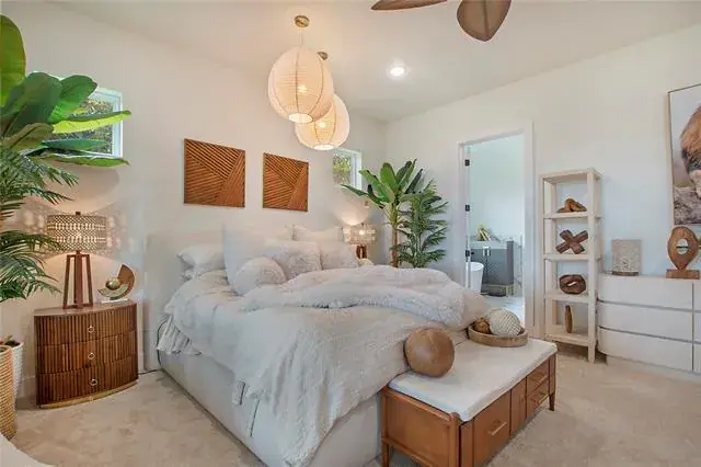 The primary suite on the main level offers a serene retreat, complete with a spa-inspired en-suite bath and a large walk-in closet. Upstairs, a versatile loft and spacious secondary living area provide endless options—media room, home office, or creative studio.