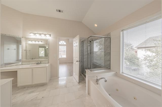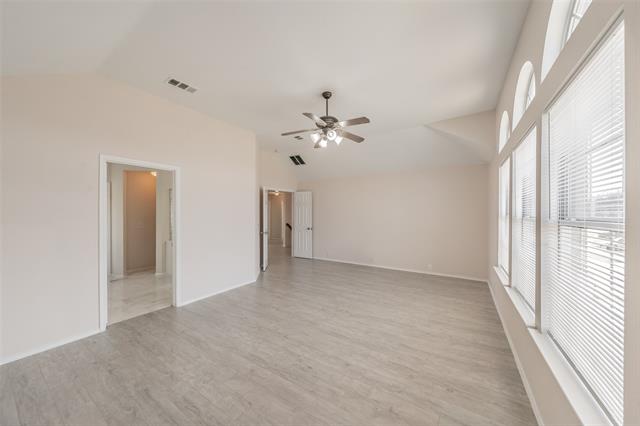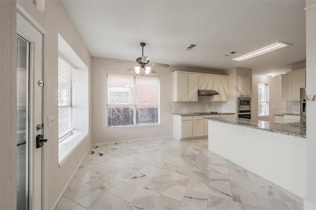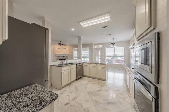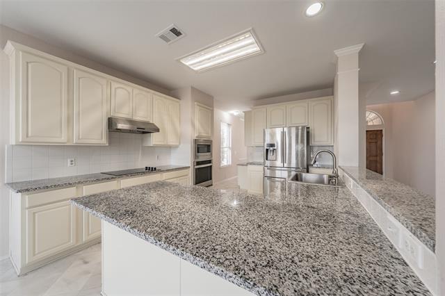 This beautiful brick and stone two-story home sits king of the hill overlooking the 10th hole of Arnold Palmer’s final golf course design, Fossil Creek. The home welcomes you with a charming covered front porch and features a light, bright open floor plan perfect for everyday living and entertaining. The spacious living room showcases a cozy gas fireplace and flows seamlessly into the open kitchen, which boasts granite countertops, freshly painted cabinets, stainless steel appliances including a French door refrigerator, a pantry, breakfast bar, and breakfast nook. A formal dining room provides the perfect space for entertaining. Downstairs includes a private office that can easily serve as a fifth bedroom, along with a convenient half bath. Upstairs offers a spacious bonus room ideal for a game room or second living area. The oversized primary suite features abundant natural light and a luxurious ensuite bath with separate his-and-her sinks, a jetted tub, tiled shower, and a generous walk-in closet. Secondary bedrooms are well-sized and include spacious walk-in closets. Beautiful tile flooring enhances the wet areas, while luxury vinyl plank flooring extends throughout the upstairs, dining room, and living room. Enjoy year-round outdoor living with a covered sunroom and outdoor kitchen area overlooking a large patio. The backyard offers incredible views of the golf course and pond, creating a peaceful setting. Additional highlights include a two-car garage with epoxy flooring and a new heating and cooling system. Conveniently located with easy access to Highway 35 and Loop 820, it is approximately 20 minutes from downtown Fort Worth and just minutes from Keller.