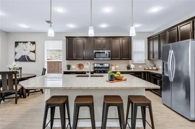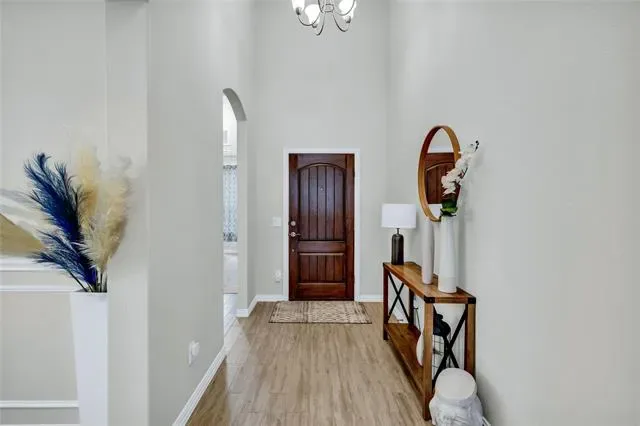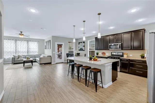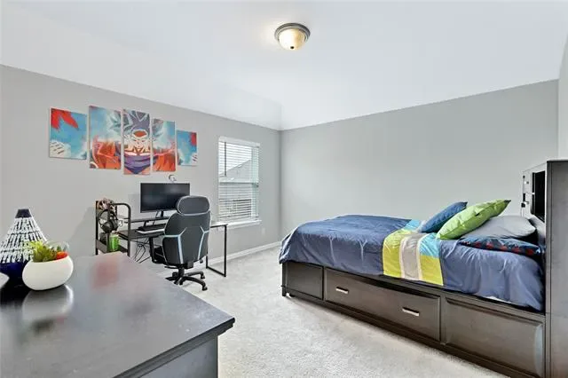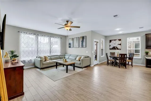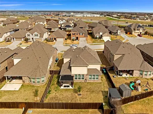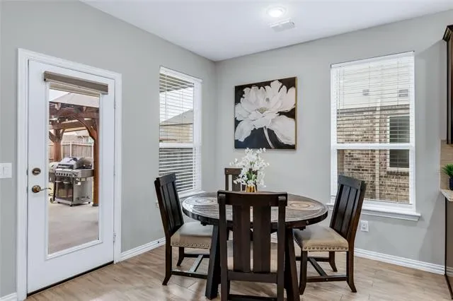 Welcome to a beautifully designed 2021 Pulte home featuring the popular Mooreville floor plan, located in the highly sought-after Northwest ISD. This thoughtfully designed home offers the perfect balance of space, comfort, and flexibility with 4 bedrooms and 3 full bathrooms, including two bedrooms downstairs and two upstairs. The layout was built for modern living, featuring two dining areas, a private den ideal for a home office, &' a dedicated media room perfect for movie nights, gaming, or entertaining guests. The open design creates a seamless flow for everyday living while still offering separate spaces to work, relax, and gather. Step outside to a covered back patio currently set up with comfortable outdoor seating, making it a great space to unwind or host friends and family. The tandem two-car garage adds incredible functionality with refinished garage floors and built-in cabinetry for extra storage. A standout feature is the permanent Govee smart lighting installed on the exterior, allowing customizable lighting for holidays, game days, or everyday curb appeal. A modern layout and a fantastic location make this home one you won’t want to miss.