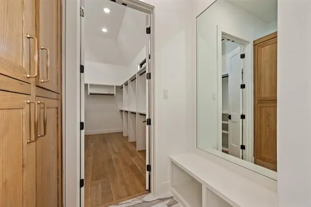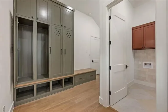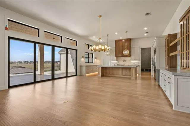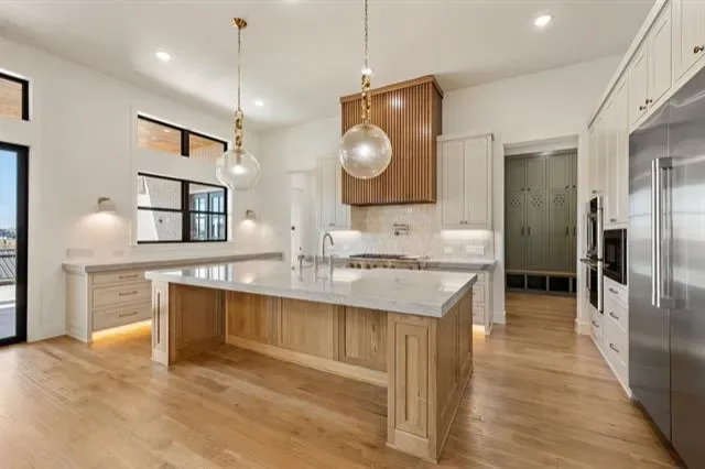 Step into an expansive open-concept great room, kitchen, and dining area, perfectly designed for entertaining. The chef-inspired kitchen features an upgraded appliance package including a 48” 6-burner gas cooktop, double wall ovens, and a built-in refrigerator. Custom cabinetry throughout the home is enhanced by soft-close drawers, floating shelves, and under-cabinet toe-kick lighting, adding both style and convenience.