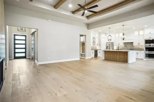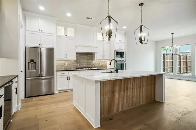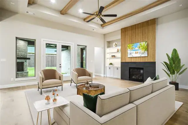 NEW CONSTRUCTION SINGLE STORY HOME IN DESIRED GATED COMMUNITY IN KELLER ISD! Move In Ready! Home has 3 large bedrooms, 2 full baths, 1 trendy powder bath, office and outdoor patio with fireplace! Home features a front courtyard with lighting, lush landscape and seating area. Back patio has ceiling fan, gas fireplace w mantle, wiring for tv & sound and gas grill stub. Interior boasts engineered woods, designer tiles, quartz counters and decorative lighting throughout! Kitchen offers oversized island, custom cabinets to ceiling with lighted glass display, wine bar with beverage fridge and large walk in pantry with appliance counter. Open concept family room features 12′ ceilings boxed up to 13′ with stained beams & 5.1 surround sound wiring, gas fireplace feature wall and LED lit floating shelves w storage below. Builder installed DSC security system on all exterior doors & windows & prewired for CCTV. Plus installed structured can, TV & data, Cat5e & RG6 runs. HVAC is Lennox 4 Ton 16 series with Ecobee thermostat. Home has a 10 year structural, 2 year mechanical and 1 year craftsman warranty.