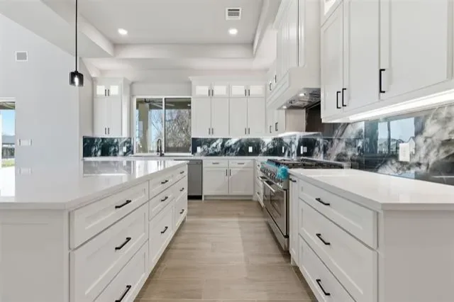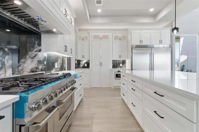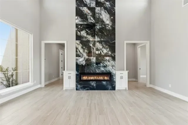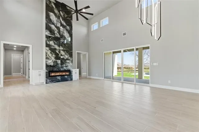 Inside, the open-concept layout makes an immediate impression with soaring ceilings, expansive windows, abundant natural light, and a dramatic floor-to-ceiling fireplace anchoring the main living space. The kitchen was designed to stand out, featuring a large island, premium appliances, generous cabinetry, and a hidden pantry that adds both style and function. The dining and living areas flow seamlessly, creating an ideal setup for entertaining or everyday living.