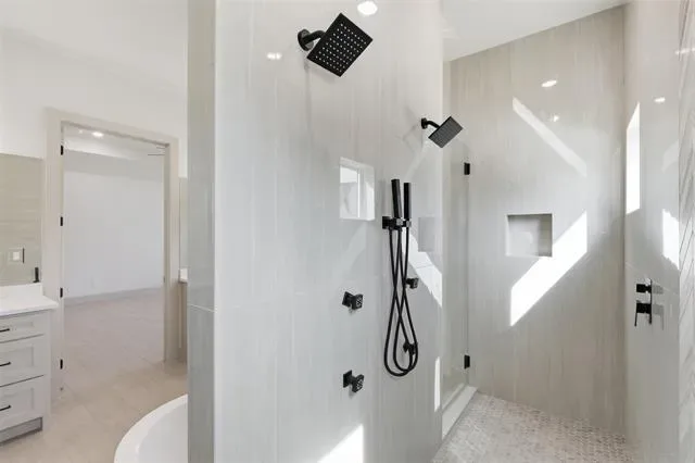 Set behind the gates on more than an acre of tree-backed land, this brand-new custom home delivers a rare blend of privacy, luxury, and peaceful design within highly rated Mansfield ISD. Double iron glass entry doors open to light-filled living spaces finished in soft beige neutrals and warm textures, creating a calm, elevated atmosphere built for everyday comfort. The open living area is anchored by a striking fireplace and expansive sliding doors that lead to a huge covered patio and pool, where mature trees provide added serenity and seclusion.