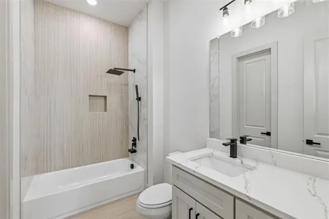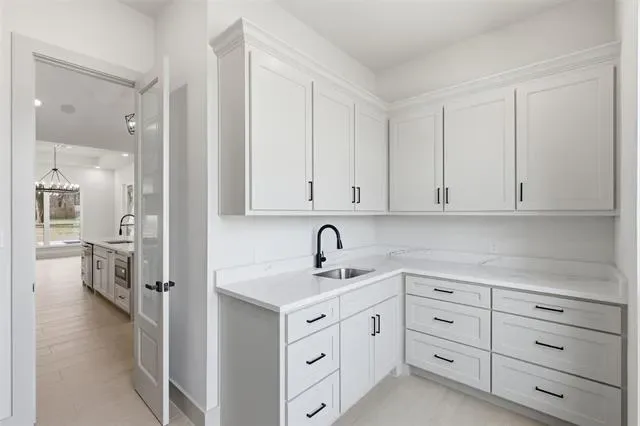 At the heart of the home, the chef’s kitchen combines beauty and performance with an oversized quartz island, custom cabinetry with built-in spice racks and utensil storage, a ZLINE luxury oven and cooktop, a massive walk-in pantry, and an oversized built-in refrigerator—ideal for gathering, hosting, and daily living. The private primary suite offers dual sinks, a dedicated vanity, a soaking tub, and a spa-inspired layout, along with convenient access to the laundry room featuring cabinetry and folding space. Thoughtful flexibility continues with a private office, a large window-lined dining area, three bedrooms on the main level, and a spacious upstairs bedroom with a full bath—perfect for guests or multigenerational living—plus a side-entry two-car garage and intentional custom craftsmanship throughout.