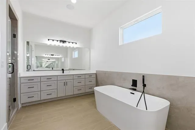 Bold modern design meets effortless livability in this brand-new custom home set on more than an acre within a gated community in highly rated Mansfield ISD. Striking black-and-white tones, warm wood accents, and clean architectural lines create a refined first impression, beginning at the double iron glass entry and continuing into expansive, light-filled interiors designed for both everyday comfort and elevated entertaining. A porte-cochère with expansive parking enhances both convenience and curb appeal, while the rear-facing two-car garage preserves the clean front elevation and thoughtful approach. The open living space flows seamlessly to a huge covered patio with an outdoor kitchen and pool, delivering true indoor-outdoor living with room to gather, relax, and unwind.