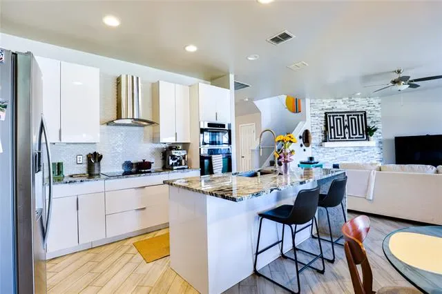 Welcome to this beautifully maintained Fort Worth gem, where modern updates meet comfortable living! Step into an open-concept floor plan designed for effortless flow and everyday functionality. The spacious living area features a striking floor-to-ceiling wood-burning fireplace and is flooded with natural light from large windows throughout the home. Smart home upgrades include smart light switches, a Nest thermostat, and exterior security cameras for added convenience and peace of mind. The chef-inspired kitchen is a true showstopper, boasting elegant granite countertops with a waterfall-edge island, stainless steel appliances, an induction cooktop, stylish pendant lighting, recessed fixtures, and abundant cabinet space. Step outside to relax or entertain under the oversized covered patio, overlooking a lush, fully fenced grassy backyard—perfect for pets, play, or gatherings. Ideally located just minutes from major highways, premier shopping, and top dining destinations, this home offers the perfect blend of comfort, style, and convenience. Refrigerator, washer, and dryer are negotiable.