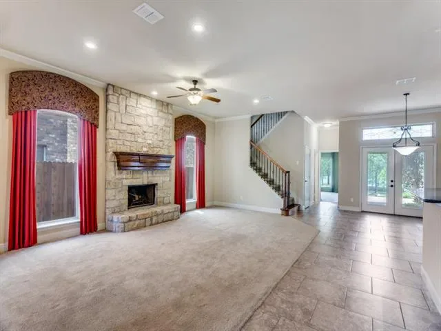 Welcome to Trinity Lakes! Spacious 4 bedroom, 3 bath home, 2 car garage with approximately 2,695 Sq. Ft. This one owner two story brick and stone home has be meticulously taken care of. Open floor plan with split bedrooms. Kitchen features custom wood knotty alder cabinets, black appliances, breakfast bar, walk-in pantry and breakfast dining. Large living room with wood burning fireplace opens the kitchen and formal dining room. Primary suite includes sitting area with view of the garden like backyard and greenspace, separate shower, jet-tub, dual vanities and walk-in closet. Separate utility room with sink and built-in cabinets. Second bedroom with full bathroom downstairs. Upstairs features two bedroom with Jack n Jill bathroom with separate vanities. Third bedroom with 10 x 7 covered deck with views of the lake. Fourth bedroom with built-ins. Fenced backyard on green space and lake. Tall ceilings, crown moldings, 5.5 inch baseboards, granite counters, insulated garage doors. Updated photos to come this week.